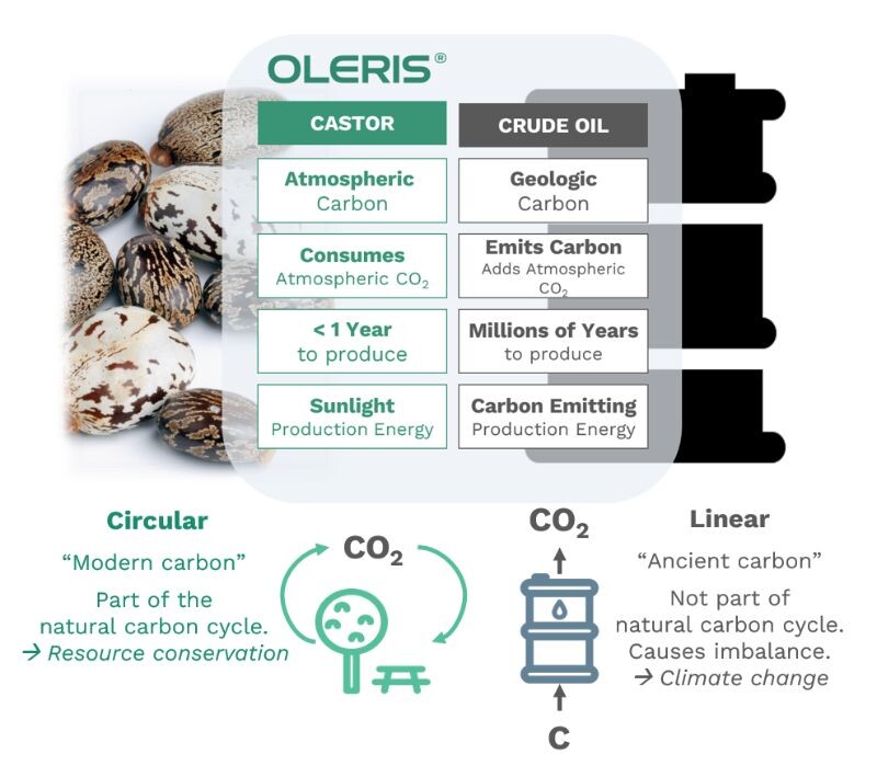 Oleris® advanced bio-materials are a 100% bio-based range of C7, C11, and C18 oleochemicals made from the renewable feedstock castor oil through a process unique to Arkema. Oleris® advanced bio-materials have high purity, are REACH registered, KOSHER and HALAL certified, GMO-free, and ready to serve as carbon-neutral building blocks for your next sustainable technology development.