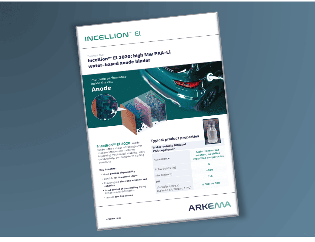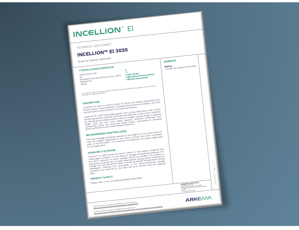 Incellion™ El 3020 is a PAA-Li binder for lithium-ion battery electrodes. PAA binders deliver robust adhesion, excellent electrochemical stability, and they are particularly recommended in Si-anode formulation.